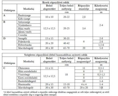 Az alábbi táblázatból megtudhatod, hogy a különféle madaraknak milyen odúkra van szüksége.